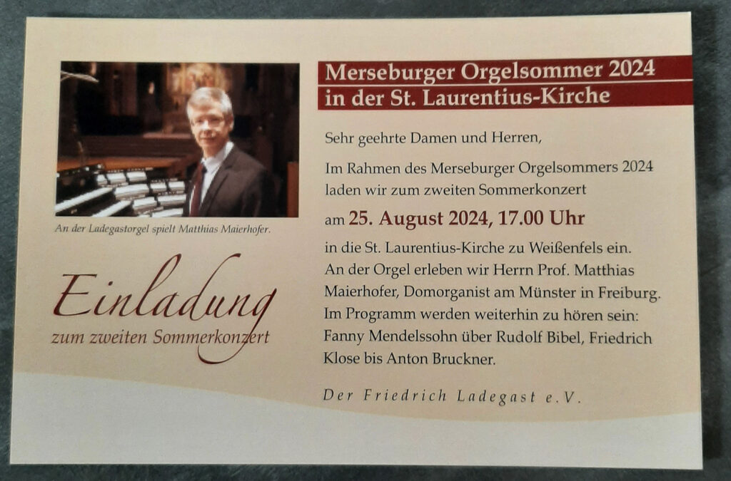 Nach dem Konzert ist vor dem Konzert und so kündigen wir zwei weiter Orgelkonzerte, die im Rahmen des Merseburger Orgelsommers stattfinden, an und laden herzlich ein! (s. Bilder)