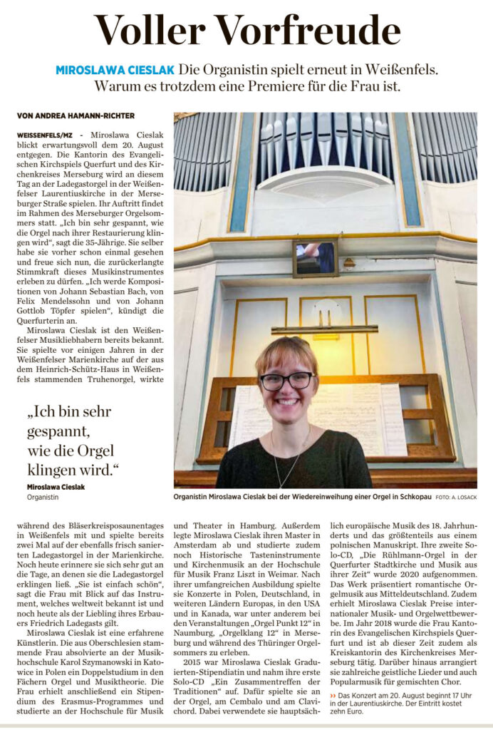 Voller Vorfreude – Miroslawa Cieslak – Die Organistin spielt erneut in Weißenfels. Warum es trotzdem eine Premiere für die Frau ist.